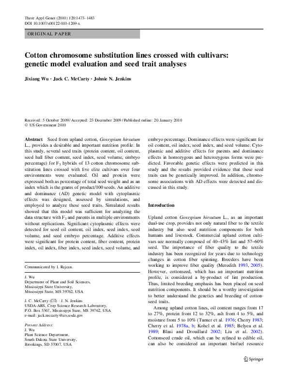 Pdf Cotton Chromosome Substitution Lines Crossed With Cultivars Genetic Model Evaluation And Seed Trait Analyses Johnie Jenkins Academia Edu